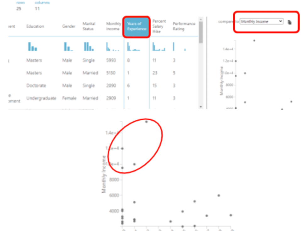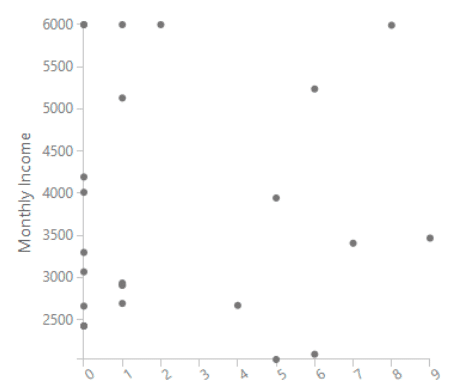 โดยตัวอย่างที่เราจะแสดงให้เห็นการจัดการกับ outliers คือ Employee Dataset เมื่อเรา visualize ดู ข้อมูลคอลัมน์ Years of Experience กับ Monthly Income เราจะได้กราฟดังนี้