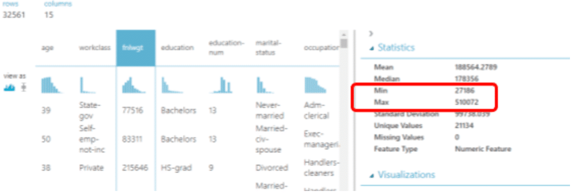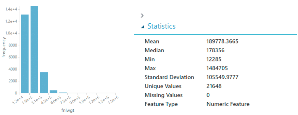 ต่อมาเราจะมาดูตัวอย่าง Adult Census Income ซึ่งเป็น sample dataset ของ AzureML เมื่อเรา visualize ดูข้อมูลซึ่งเราจะใช้วิธีการอีกรูปแบบหนึ่ง ซึ่งคอลัมน์ที่เราต้องการจะจัดการกับข้อมูลคือ fnlwgt ซึ่งมีลักษณะข้อมูลตามรูป