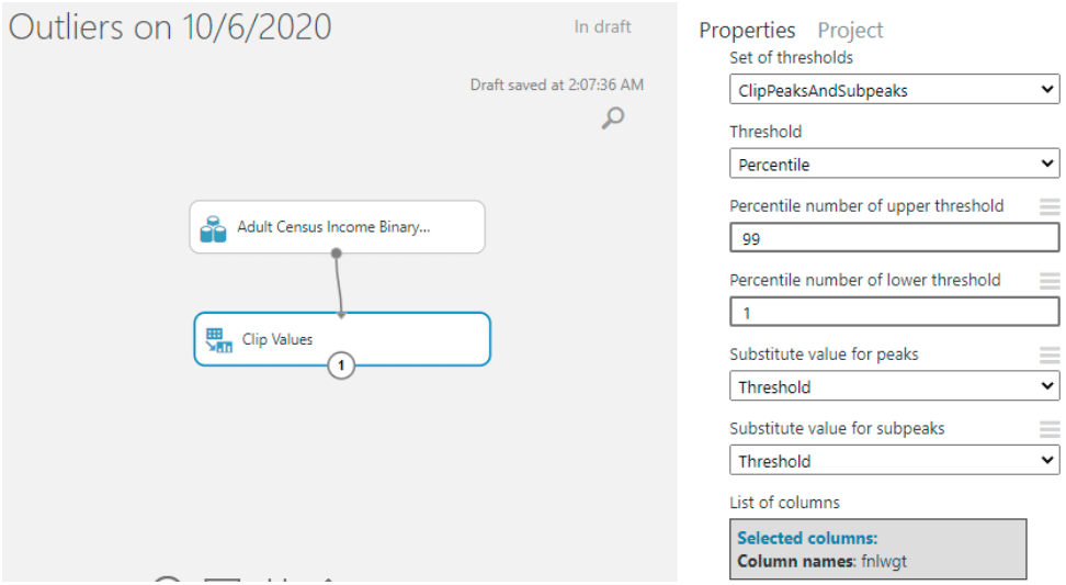 Outliers คือข้อมูลที่มีระยะห่างจากข้อมูลตัวอื่น ๆ มากและส่งผลต่อผลการทำนายของเรา ซึ่งทำให้ผลการทำนายของเรามีความคาดเคลื่อนมาก โดยวิธีการแก้ปัญหานี้ คือ การ visualize เพื่อดูข้อมูลจากกราฟ การกำหนดไม่ให้มีค่าเกิน Percentile ที่เราต้องการ ซึ่งวิธีการเหล่านี้สามารถทำได้โดยใช้ module ที่ชื่อว่า Clip Values
