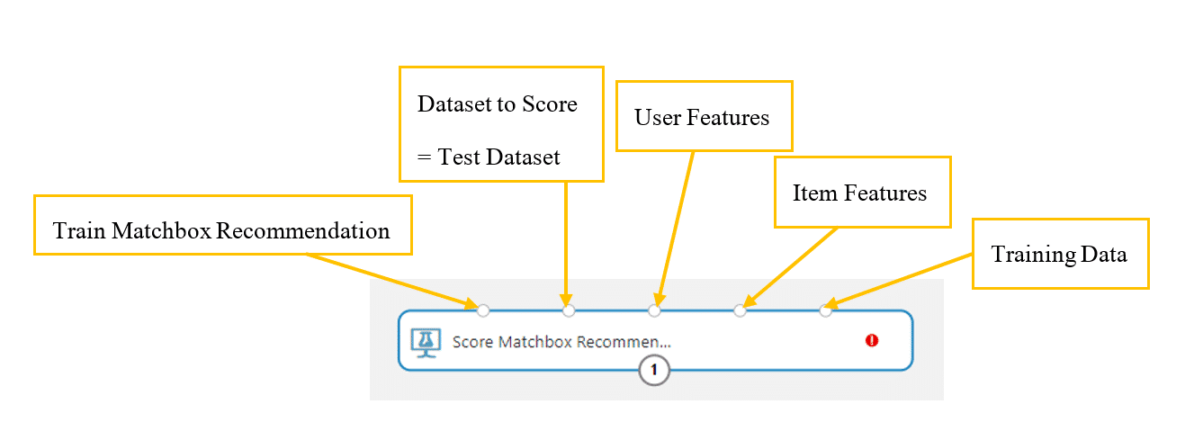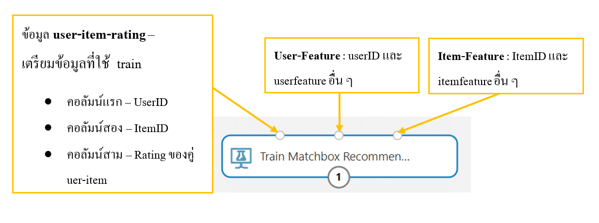 6.  ค้นหา module ที่ชื่อว่า Train Matchbox Recommendation โดยแต่ละจุดเชื่อมต่อของ module มีวิธีการเชื่อมต่อดังนี้
