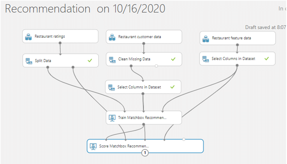 โดย Matchbox Recommendation System มี module ที่ใช้คือ Train Matchbox Recommendation, score Matchbox Recommendation และ Evaluate Recommender ซึ่ง Train Matchbox Recommendation จะอ่าน dataset เรียง user-item-rating