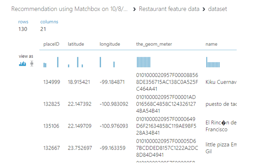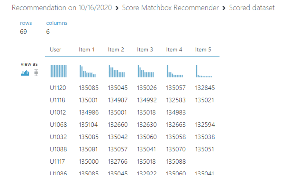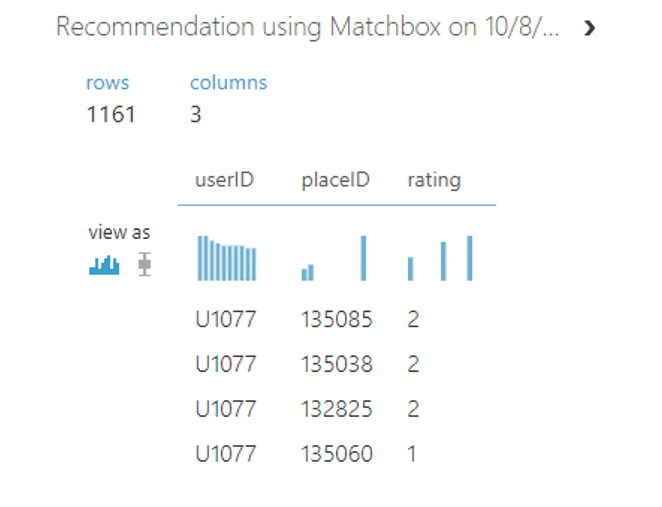 เมื่อเรา visualize ดูตรง Score Matchbox เราจะพบว่า user แต่ละ ID จะมี ID ของร้านอาหารหรือ itemID แนะนำอยู่ว่าลูกค้าแต่ละคนเหมาะสมกับร้านอาหารใดบ้างซึ่งแนะนำมาไม่เกิน 5 ร้านตามที่เราได้ตั้งค่า parameter ไว้