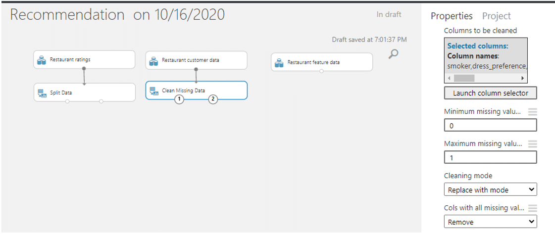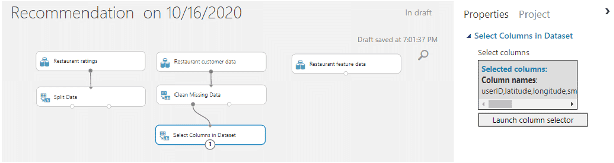 4.  นำ module ที่ชื่อว่า Select Columns in Dataset มาเชื่อมต่อกับ Clean Missing Data เพื่อเลือกเฉพาะคอลัมน์ที่มีผลในการแนะนำ โดยคอลัมน์ที่เลือกคือ userID, latitude, longitude, smoker, drink_level , dress_preference, ambience, marital_status และ birth_year
