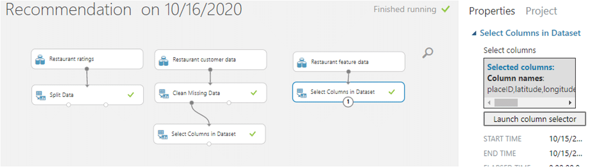 5.  นำ module ที่ชื่อว่า Select Columns in Dataset มาเชื่อมต่อกับ Restaurant Feature data เพื่อเลือกเฉพาะคอลัมน์ที่มีผลในการแนะนำ โดยคอลัมน์ที่เลือกคือ placeID ,latitude, longitude, alcohol, smoking_area, dress_code, price และ Rambience จากนั้นคลิก RUN